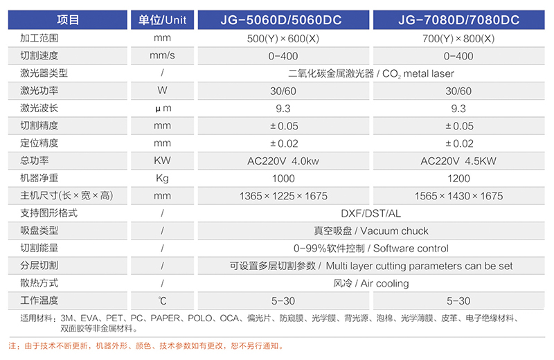 适用材料范围: 3M/PET/PC/PAPER/OCA/防窥膜/防爆膜/背光源/扩散/泡棉/光学薄膜/电子绝缘材料/皮革/双面胶/特殊材料石墨烯等非金属材料进行完美切割。